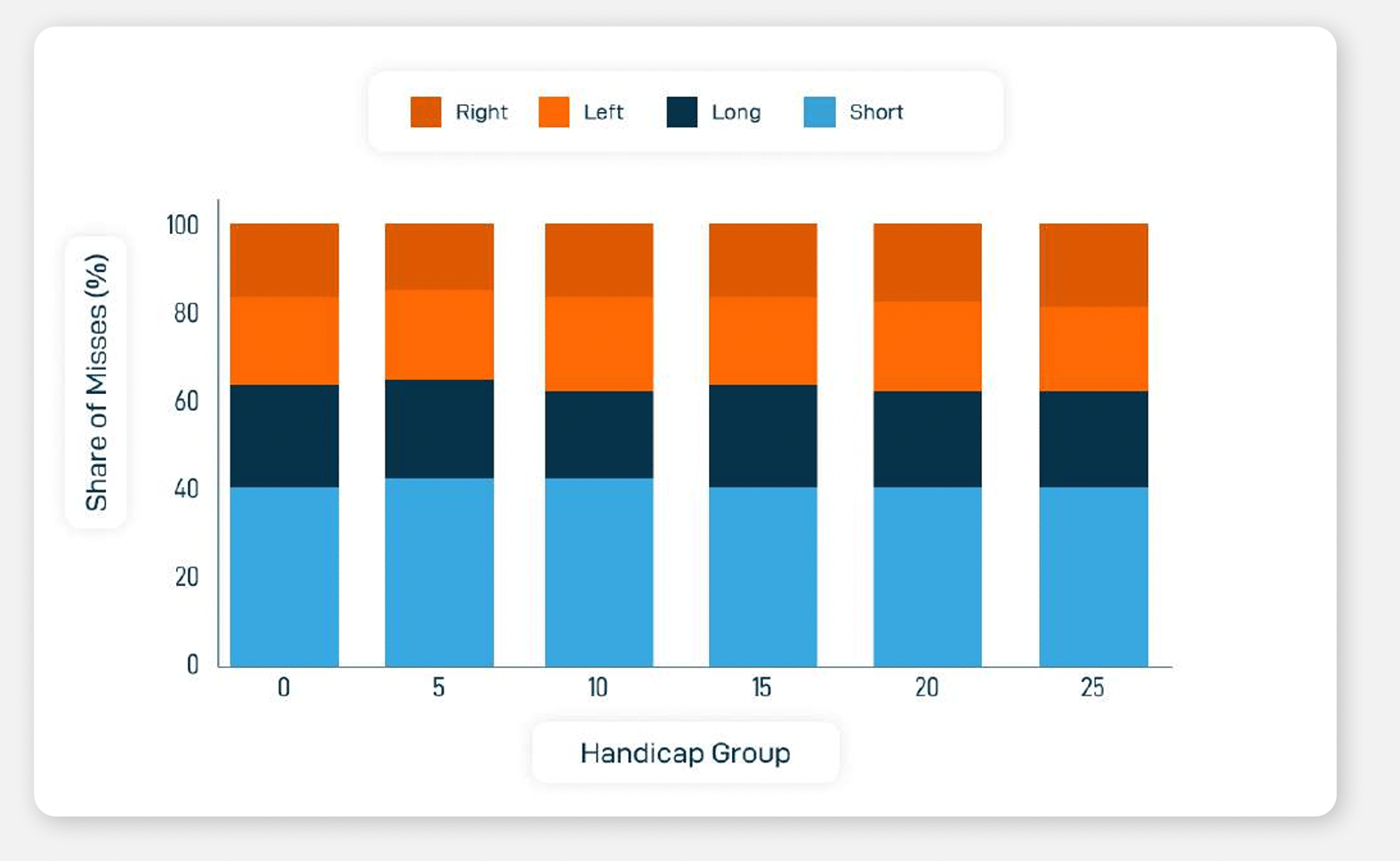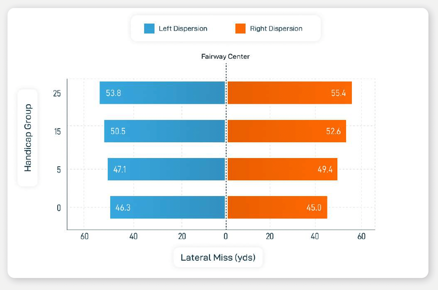 Driver dispersion across handicaps isn't crazy.I thought the off the tee dispersion would skew way to the right... but it's pretty equal. You can see that the 0 handicap has gained some consistency with their dispersion but not a ton more than a 15 handicap.