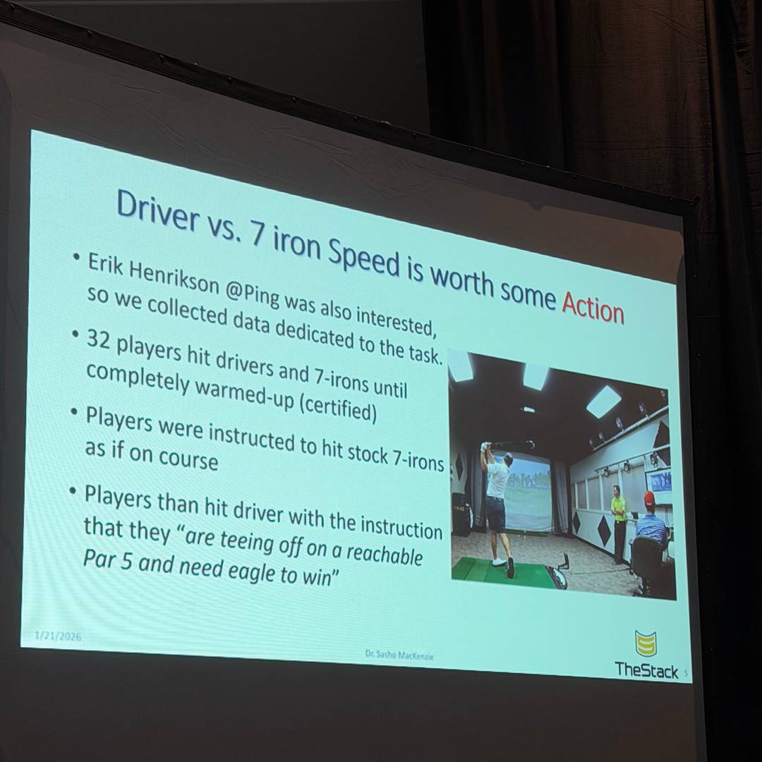 I’m also really curious about Chalkless. It removes oils from your hand and increases friction. I did their torque test at the show and the difference was obvious. I'm going to go nuts for speed training, trying out the new Marucci glove with Chalkless on the right hand 😂 TPT Pulse Putter ShaftI spent time with Jake with Golf.com looking at the new TPT Pulse putter shaft. TPT already makes some of the lowest torque shafts out there for drivers, hybrids, fairway woods (Best driver shaft I've hit!) Low torque matters in putting because the shaft isn’t twisting during the stroke. Jon Sinclair’s data shows it can make a difference even on ten-foot putts. What TPT added here is frequency tuning. Pulse 50 is more muted. Pulse 70 has more click and higher pitch. Most feel is sound. This lets you change sound and feel without changing your putter head. Golf balls are going to be ChipdThis might be the most exciting long-term idea I saw. Chipd is putting a chip inside a golf ball. It tracks distance, speed, launch, spin. Soon it’ll track putting practice sessions. Makes. Misses. Tendencies. The key thing is it feels normal. Sounds normal. No harsh click. They’ve hit drivers with it. It didn’t blow up. I really believe this is where things go... Not next year maybe. But eventually every ball has a chip. The tech gets smaller. Prices come down. GPS and speed live inside the ball itself. Every shot gets tracked automatically. No setup. No extra devices. Green Reading and Putting PracticeI still think green reading is one of the most under-practiced skills in golf. I’m a big fan of Tour Read and Ralph Bauer’s system and we've done some great content with him. You’ve probably seen their AR goggles before. Super cool. Also expensive and clunky. The app changes that. You scan the green with your phone. It maps the topography live and gives you an aim point. Then you can set up gates and actually practice reading greens instead of guessing. WhyGolf Wrist X + Getting RoastedWhyGolf released a new wrist training aid called the Wrist X. Super solid new training aid (we have more content on this soon) They also had Brian Baumgartner (he was Kevin from the office) running a putting competition at the booth. I did not win. I got roasted. LAB Golf DF3 UpdateLAB added a stainless steel insert to the DF3 (their most popular putter). Some of you are going to love that! Open Forum. The late night golf instruction event of the yearI got there late but stayed till after 12:30 and there was some awesome info 😂 Dr. Sasho gave one of the more interesting talks I’ve heard in a while. Here's the question... You tee off with someone on a par three, hit similar irons, then on the next hole you hit driver and they’re 30-40 yards past you. Why does that happen? Might have to ask him to share this with us another time! Stephen Sweeney also shared something that felt obvious once he said it, but I’d never heard the numbers. The top 50 putters in the world have an arc between about 11 and 15 degrees. More important, their face stays within one degree of that arc about 78 percent of the time. As putting gets worse, that percentage drops fast. That feels like just a portion of what happened! You must, must, must watch the new video we just dropped and go browse Instagram to see all the reels LINK So proud of the team for absolutely crushing it this week.